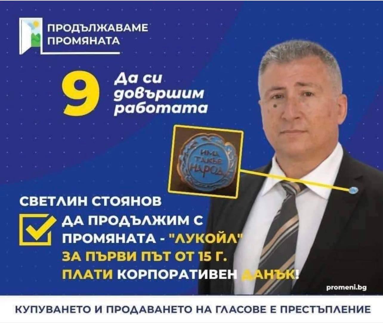 Уникален гаф сътвориха за пореден път от "Продължаваме промяната". Отцепникът от ИТН Светлин Стоянов, който скочи в ПП, се снима на предизборен плакат със значката на партията на Слави.