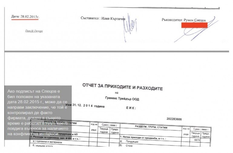 Финансовият отчет на фирмата „Гранекс Трейдър” ООД за 2014 г. е подписан от Румен Спецов на 28 февруари 2015 г. По това време той се е трудил в НАП на позиция главен инспектор в отдел “Разследване на особени случаи” на ТД на НАП София. Информацията се открива в НАПЛийкс. Посочено е също, че достъпът на Спецов до електронните системи на приходното ведомство е прекратен на 18 април 2015 г. При тези данни възниква въпросът дали Спецов не е бил в сериозен конфликт на интереси, пише сайтът „Bird.bg“.