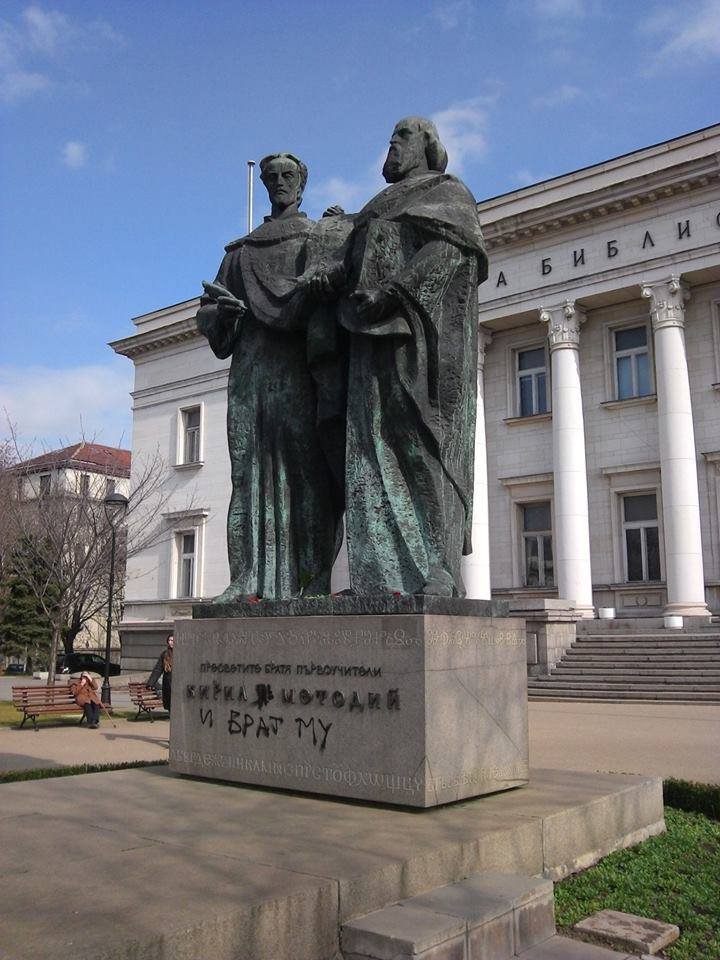 Вандали изрисуваха паметника на Св. Св. Кирил и Методий пред Националната библиотека.