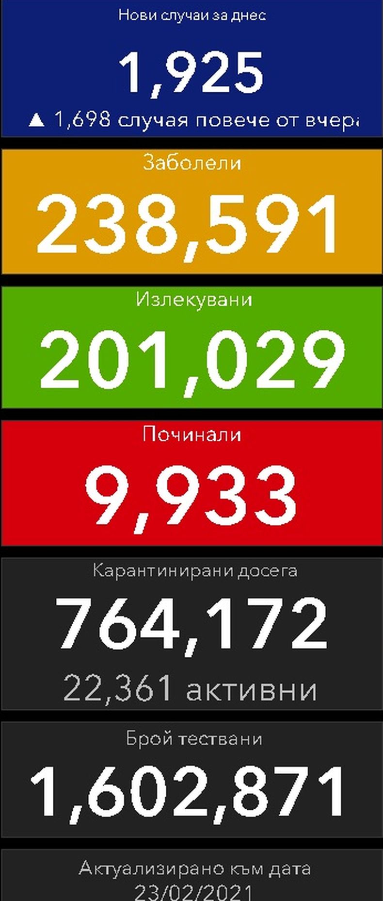 238 591 са вече положителните проби на заразени с коронавирус у нас. Това сочи справката на Единния информационен портал, обновен с данните от изследваните през вчерашния 22 февруари, видя ПИК. 27 629 са активните случаи.