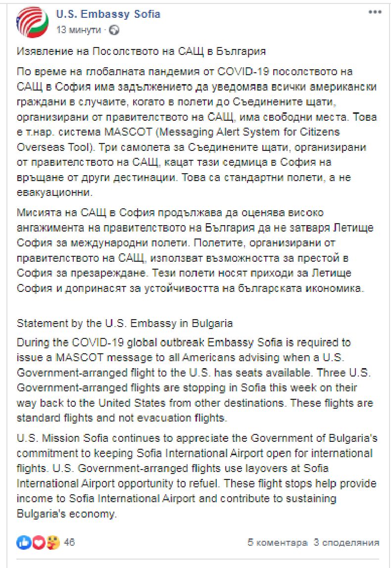 "Мисията на САЩ в София продължава да оценява високо ангажимента на правителството на България да не затваря Летище София за международни полети. Полетите, организирани от правителството на САЩ, използват възможността за престой в София за презареждане. Тези полети носят приходи за Летище София и допринасят за устойчивостта на българската икономика", това пише в изявление на посолството на САЩ у нас. Документът е публикуван на страницата на амбасадата във фейсбук.