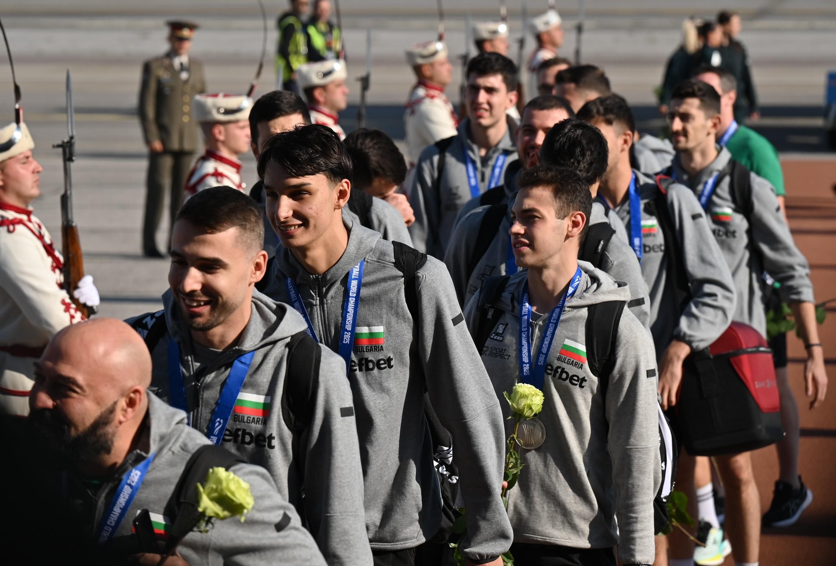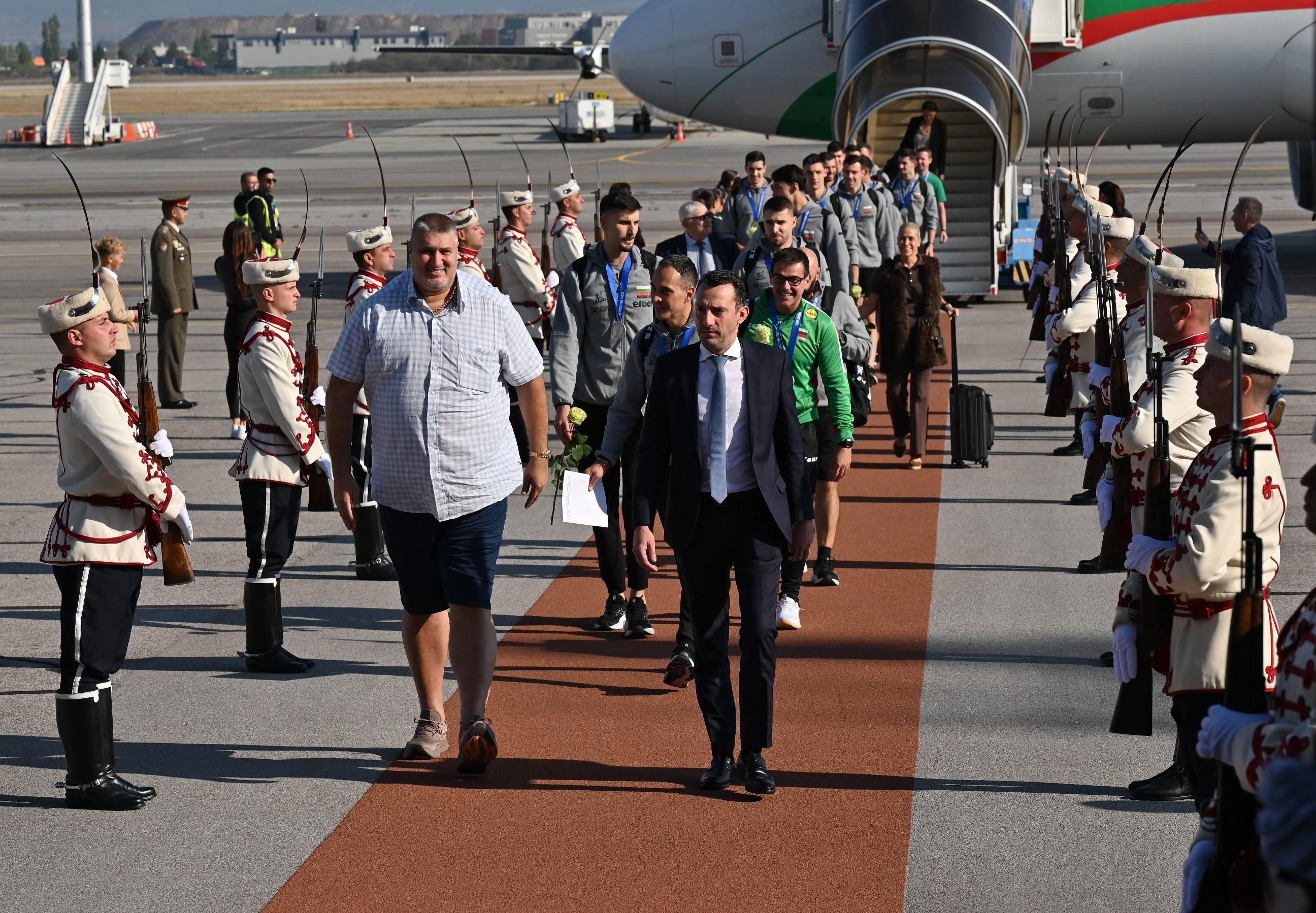 Националите ни по волейбол се завърнаха на родна земя. Точно в 10 ч. отборът кацна с правителствения самолет на летището в София. Там ги очакваше гвардейски шпалир.