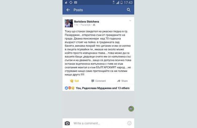 Потресаващ статус разтресе Фейсбук! Ром псува и плюе възрастна двойка в Пазарджик (СНИМКА)