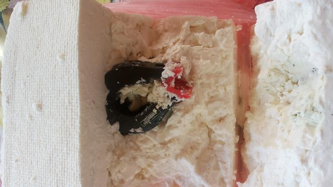 "Здравейте, вижте какво си купихме днес. В сиренето има някаква пластмасова част, а продавачите не знаят нищо за фирмата производител, освен че се казва “Богдана“, пише Галя Йорданова, прилагайки и снимки.