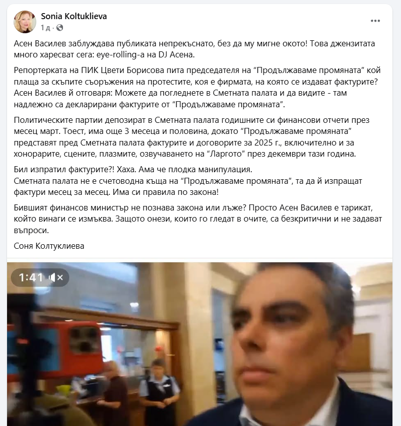 "Тоест, има още 3 месеца и половина, докато ПП представят пред Сметната палата фактурите и договорите за 2025 г., включително и за хонорарите, сцените, плазмите, озвучаването на Ларгото през декември тази година. Бил изпратил фактурите?! Хаха. Ама че плоска манипулация", добави Колтуклиева, и обърна внимание, че Сметната палата не е счетоводна къща на "Продължаваме промяната", та да й изпращат фактури месец за месец.