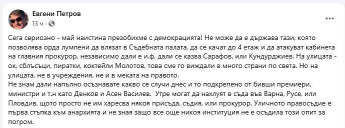 Журналистът Евгени Петров коментира в социалните мрежи вчерашните метежи в Съдебната палата, организирани от шпицкомандите на ППДБ - сдруженията БОЕЦ и "Правосъдие за всеки".