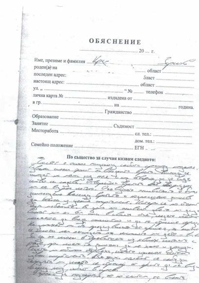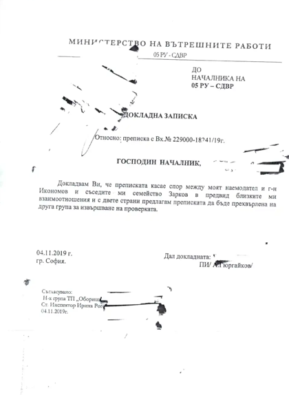 В полицейската преписка откриваме и Протокол за предупреждение срещу съпругата на Крум Зарков - Ирина Заркова. Те я предупредена да не влиза повече в "пререкания и самоуправство с лицето Кирил Икономов". Приложено е и обяснението на лицето Крум Зарков.