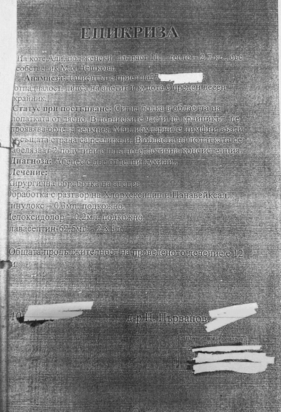 Налице е епикризата на котката Ади, съставена от д-р Н. Първанов, ветеринарен лекар от клиника в "Овча купел".