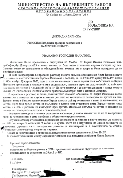 Налице са и преписките на кварталния полицай, отговарящ за района, в който живеят Крум Зарков и Мая Нешкова и Кирил Икономов. Видно от сигнала, семейството отглеждало няколко домашни любимци, сред които и котето Ади, което попаднало под ударите на настоящия служебен министър. Всички животни, които Кирил Икономов и Мая Нешкова отглеждали, са били регистрирани, ваксинирани и обезапаразитени, свидетелстват проверки на компетентните органи, инициирани по доноси на Зарков.