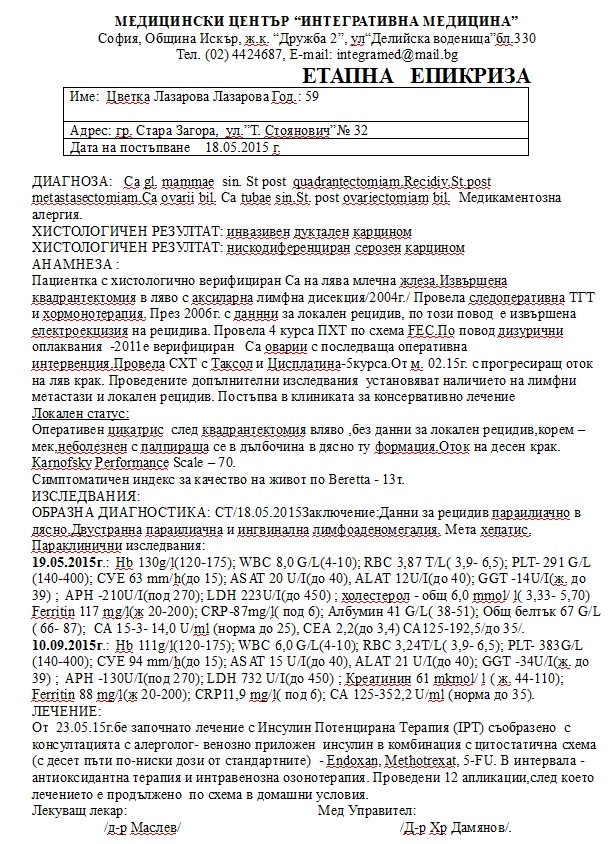 59-годишна жена от Стара Загора с новооткрит рак на яйчниците се „лекува” два месеца в Медицинския център „Интегративна медицина”. Преди години жената се е лекувала в болница от рак на гърдата, рецидив няма. Резултатът от „терапията” в онкоцентъра е 15 000 лева в касата му и влошаване на състоянието й. За този случай сигнализира след журналистическото разследване на „Монитор” нейният син Нено Николов.