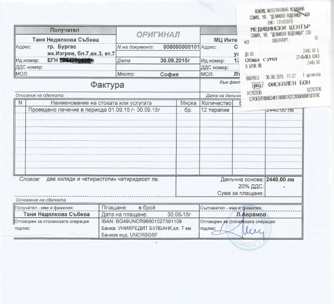 Подиграха се, излъгаха, че жена ми е излекувана. Когато им потърсих сметка защо не са казали истината, отрекоха да са казвали подобно нещо. Така започва разказа си пред „Монитор” Илиян Събев от Бургас, чиято съпруга започва „лечение” в Медицински център „Интегративна медицина” през август миналата година. По това време Събева е диагностицирана с рак на яйчниците. След седем месеца, през февруари, се оказва, че тя вече е с разсейки в черния дроб и в червата. За това време семейството брои на онкоцентъра менте 8820 лева.