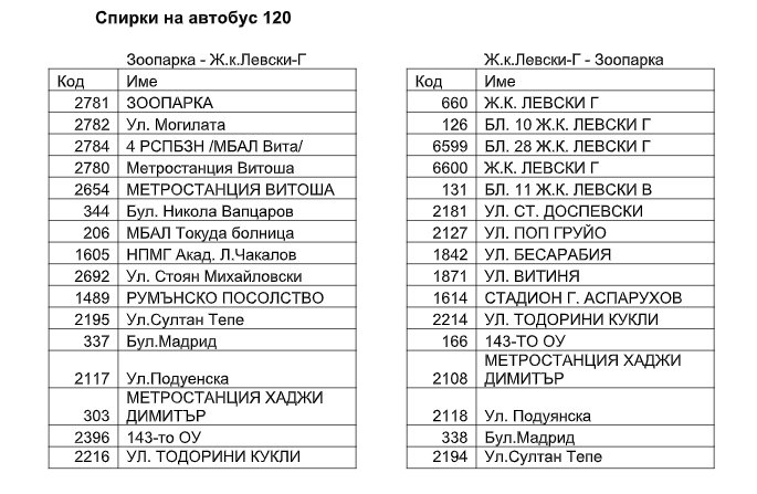Автобусите от линия № 120 нямат да спират на следните спирки: