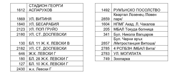 - еднопосочно - ул. „Стоян Михайловски“ скод 2190 и метростанция „Витоша“ с код 0912;