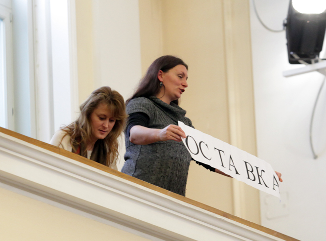 Двете протестиращи завикаха „Оставка“ точно когато премиерът Пламен Орешарски трябваше да влезе в пленарна зала за блиц парламентарен контрол. Той обаче се забави, което накара зам.-председателката на Народното събрание Мая Манолова да им се подиграе, че "гражданите малко избързаха".
