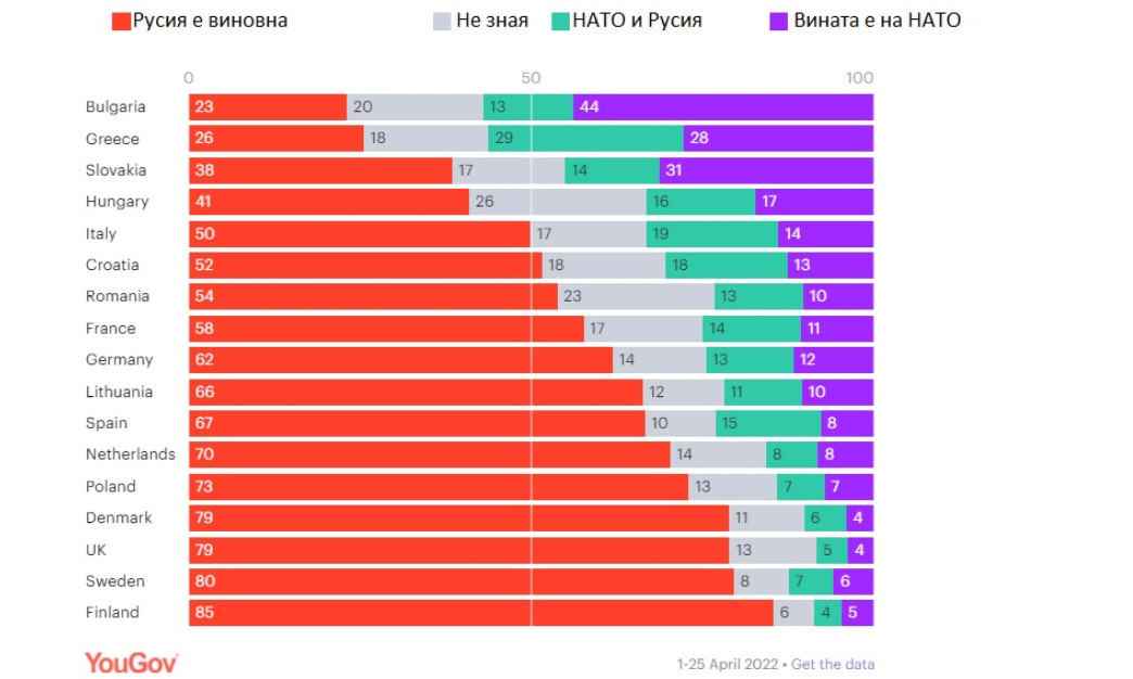 Мнозинството от гражданите на Европейския съюз са на мнение, че Русия носи отговорността за войната в Русия. В България обаче над 44% от хората са на мнение, че виновна за кризата е НАТО. Това показват резултатите от проучване на авторитетната британска агенция YouGov.