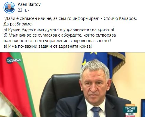 Гневни думи за управлението на здравната криза и бездействието на назначения от Румен Радев служебен кабинет отправи във "Фейсбук" проф. Асен Балтов. Той намекна за пълно разединение между президента и здравния му министър Стойчо Кацаров.