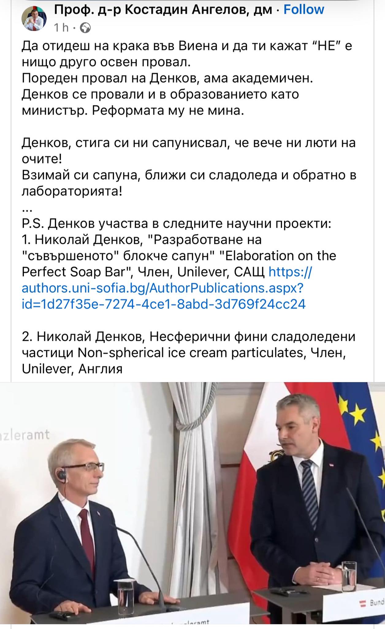 "Денков, стига си ни сапунисвал, че вече ни люти на очите! Взимай си сапуна, ближи си сладоледа и обратно в лабораторията!" Това написа в профила си във "Фейсбук" бившият здравен министър проф. Константин Ангелов. Поводът е тотално унижение, на което премиерът беше подложен във Виена днес. Канцлерът Карл Нехамер му каза в очите: "Към момента е непосилно да вземем решение за разширяване на Шенген".