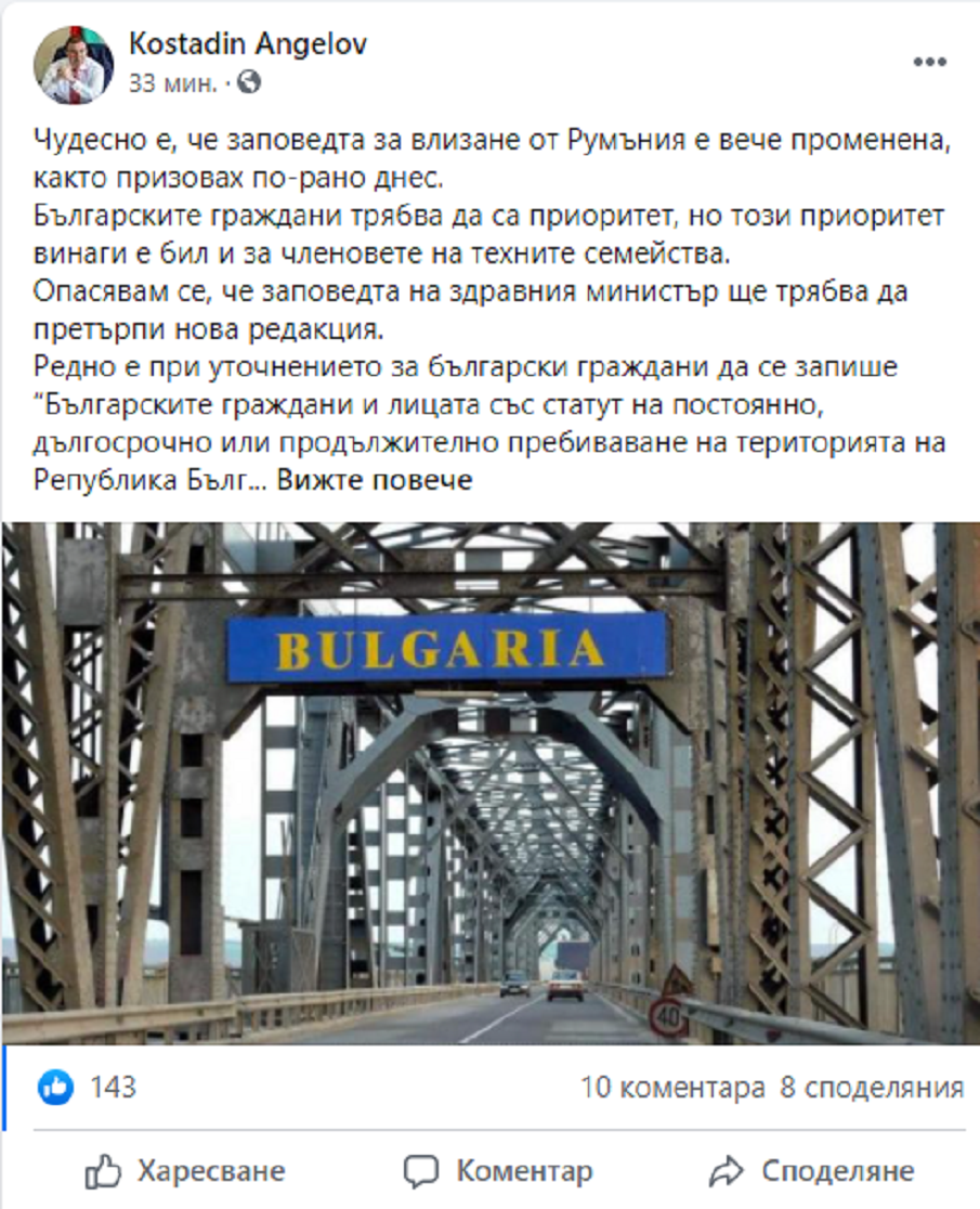 „Чудесно е, че заповедта за влизане от Румъния е вече променена, както призовах по-рано днес.