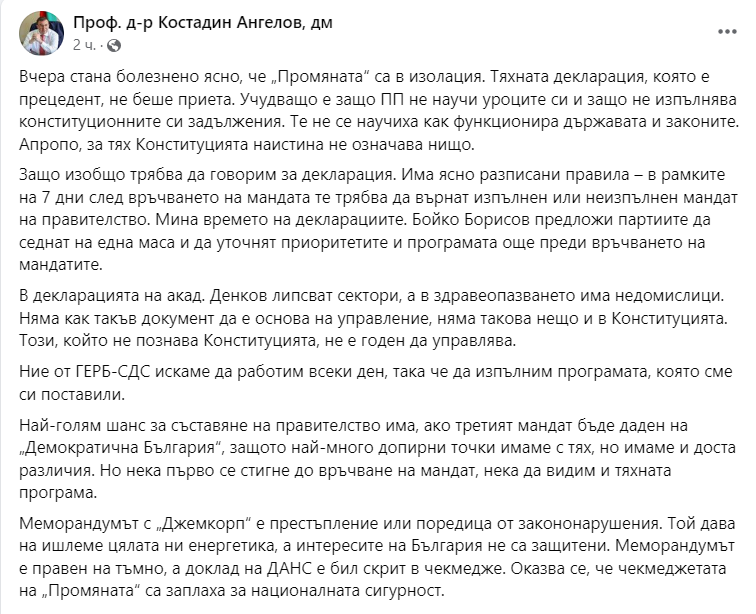 "Стана болезнено ясно, че "Промяната" са в изолация. Тяхната декларация, която е прецедент, не беше приета. Учудващо е защо ПП не научи уроците си и защо не изпълнява конституционните си задължения. Те не се научиха как функционира държавата и законите. Апропо, за тях Конституцията наистина не означава нищо.