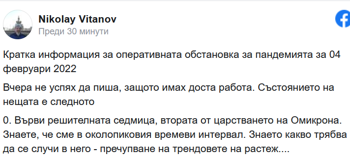 Върви решителната седмица, втората от царстването на Омикрона. Знаете, че сме в околопиковия времеви интервал. Знаете какво трябва да се случи в него - пречупване на трендовете на растеж. Пречупване на тренда на нарастване на новите случаи, пречупване на тренда на нарастване на заетостта на болничните легла, пречупване на тренда на високата смъртност. Това написа във Фейсбук профила си математикът проф. Николай Витанов.