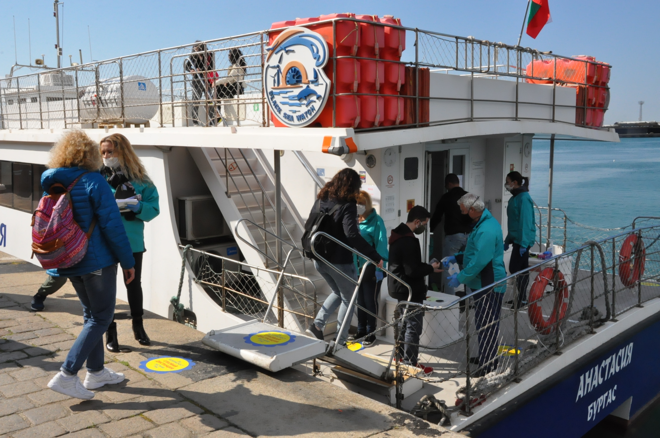 След като кораб Анастасия акостира на началната си точна - Магазия 1, палубите, стълбите и каютата на катамарана бяха щателно дезинфекцирани преди втория за деня курс до острова.