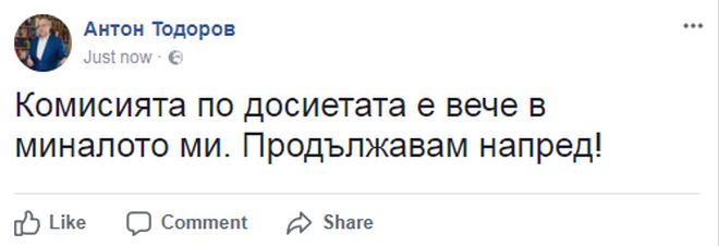 От своя профил във Фейсбук, Тодоров обяви, че продължава напред, а Комисията остава в миналото му.