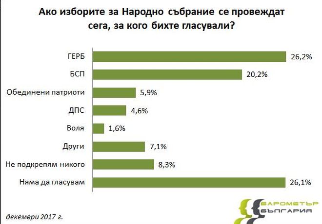 Моментната картина към декември 2017 за нагласите на гласуване за парламент наподобява отразеното при изследването на „Барометър България“ в средата на месец май. Тогава анкетираните отново биха излъчили само четири партии в парламента, като първа политическа сила би била ГЕРБ, втора – БСП, Обединени патриоти и последна – ДПС.