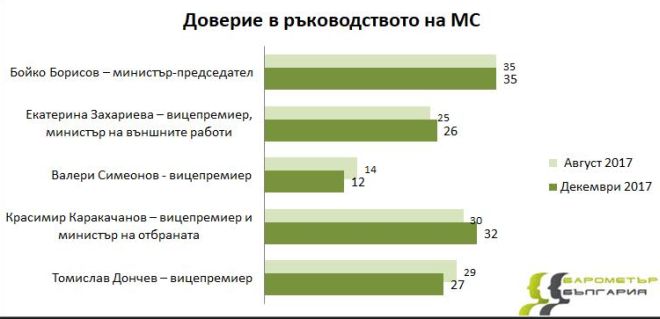 Бойко Борисов запазва позицията си с най-висок рейтинг сред представителите на кабинета с устойчив процент на одобрение 35%. Като втора рейтингова политическа фигура традиционно се откроява вицепремиерът Красимир Каракачанов. Доверието към него нараства с 2%, а към вицепремиера Екатерина Захариева - с 1%. 32% от анкетираните имат доверие в работата на Каракачанов, а 26% - в Захариева. Вицепремиерите Валери Симеонов и Томислав Дончев се одобрявани съответно от 12 и 27%.