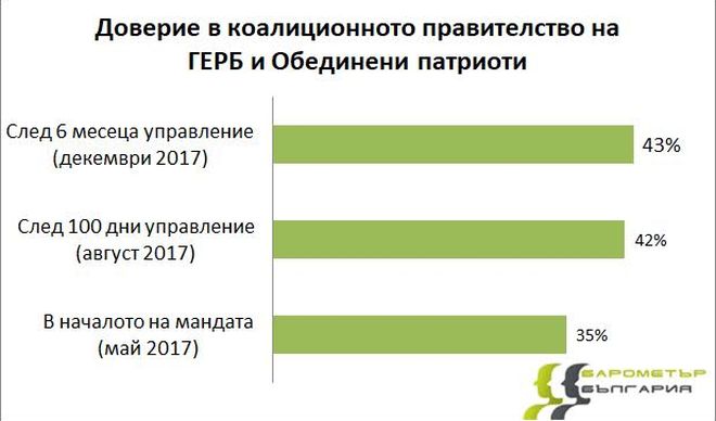 Това показват резултатите от регулярното телефонно експресно проучване на агенция „Барометър България“ в периода 14-18 декември 2017. Въпросът, зададен на анкетираните, е „Одобрявате ли работата на правителството през шестте месеца на управлението му?“. 45% от запитаните през декември изказват неодобрение, като през август процентът на неодобрение е бил 48%. 12% са без мнение през декември, при 10% при проучването от месец август.