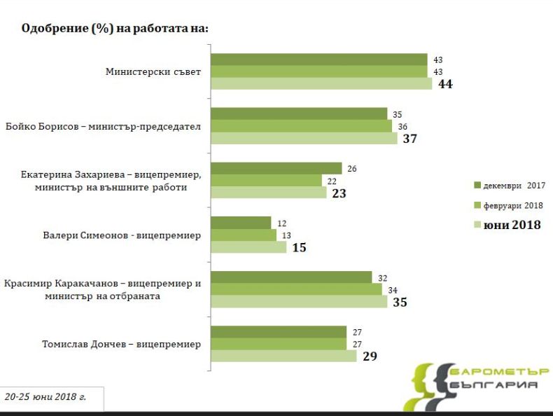 Аналогично и при заместниците на премиера се наблюдава лек ръст в одобрението към тях. Работата на вицепремиера и външен министър Екатерина Захариева е одобрявана от 23% в края на юни (за сравнение през февруари одобрението е било 22%), като това е и оценка като цяло за външнополитическата активност на кабинета по време на председателството на Съвета на ЕС.