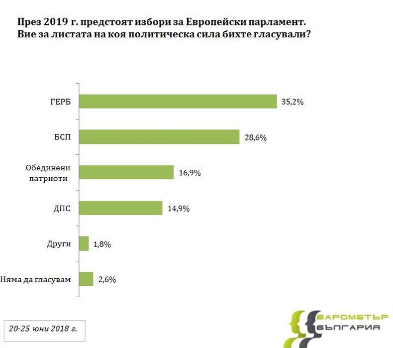 Подкрепата за политическите сили на евроизборите следващата година изглеждат така: за ГЕРБ биха гласували 35,2%, за БСП – 28,6%, Обединени патриоти – 16,9%, ДПС – 14,9%. 1,8% биха гласували за други политически формации, а 2,6% заявяват, че няма да гласуват. Така заявените нагласи сочат, че в Европейския парламент четири партии биха излъчили представители. Страната ни избира 17 от депутатите в ЕП. Ако заявените нагласи за участие в европейските избори се запазят, то разпределението на мандатите по партии би било: за ГЕРБ – 6-7 места, за БСП – 5-6 места, за Обединените патриоти – 3, а за ДПС 2-3 евродепутатски места.