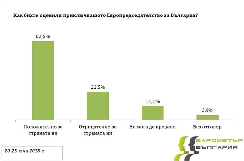 62,5% от анкетираните оценяват като положително за страната ни Българското европредседателство. На противоположното мнение са 22,5%, които заявяват, че оценяват като отрицателно приключващото Европредседателство. 11,1% отговарят, че не могат да преценят, а 3,9% не отговарят на въпроса.