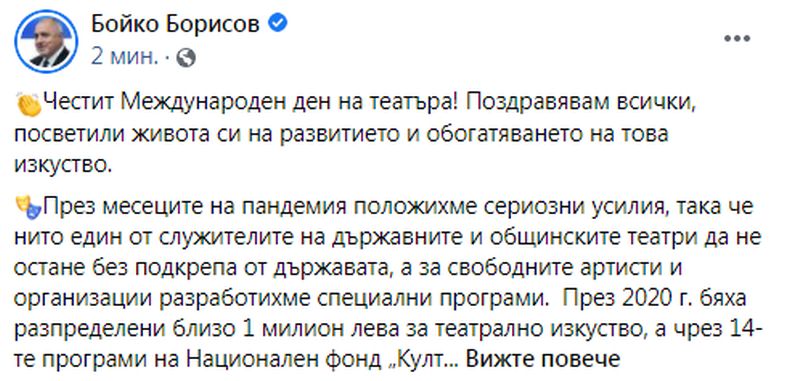"По време на мандата доказахме, че културата е безспорен приоритет за правителството. В Плана за възстановяване и устойчивост включихме специален проект „Култура и творчески индустрии в България: изграждане на приобщаваща, международно конкурентна и устойчива екосистема“ на стойност 100 млн. лв. С тази подкрепа в рамките на пет години творци и организации в областта на съвременните изкуства ще имат възможността да реализират различни проекти както в България, така и в чужбина." С тези думи в профила си във "Фейсбук" премиерът Бойко Борисов честити празника на театъра на всички, които са се посветили на сценичното изкуство.