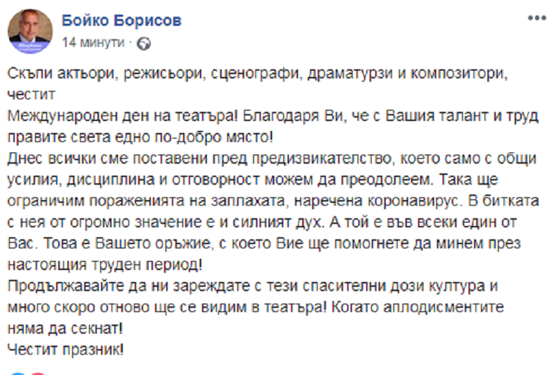 "Продължавайте да ни зареждате с тези спасителни дози култура и много скоро отново ще се видим в театъра! Когато аплодисментите няма да секнат! Честит празник!", завършва Борисов.
