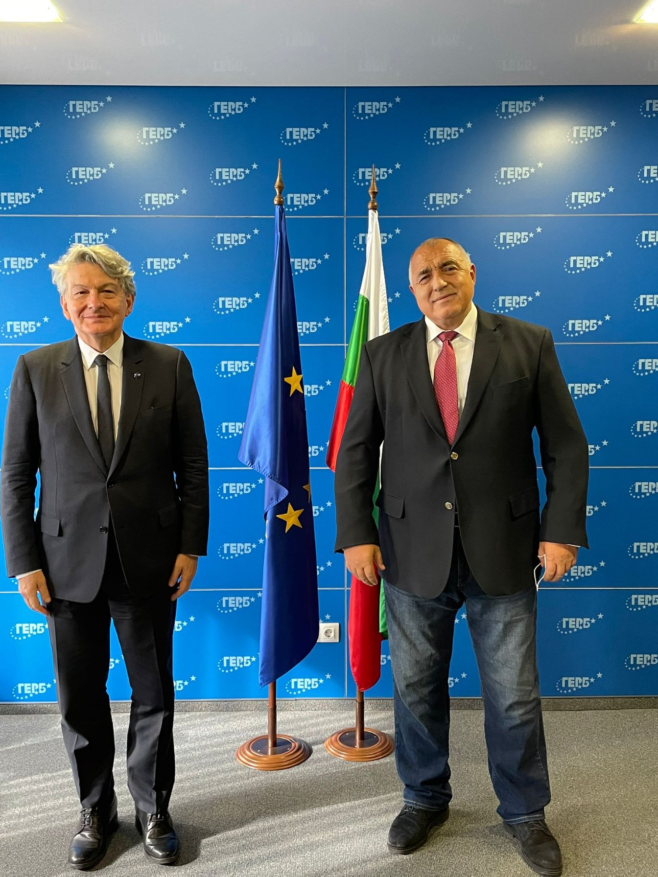 С еврокомисаря по вътрешния пазар Тиери Бретон обсъдихме ситуацията в България и Европа, свързана с COVID-пандемията. Благодарих му за помощта, която Европейската комисия ни оказа в началото на годината, за да успеем да доставим в България допълнителни количества от ваксините на „Пфайзер“ и „Модерна“, след като се появиха проблемите с доставките на ваксината на „Астра Зенека“. Това написа на страницата си във Фейсбук лидерът на ГЕРБ Бойко Борисов.