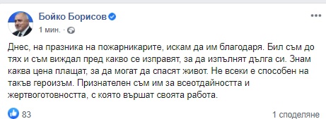 Премиерът Бойко Борисов поздрави пожарникарите за професионалния им празник. "Днес, на празника на пожарникарите, искам да им благодаря. Бил съм до тях и съм виждал пред какво се изправят, за да изпълнят дълга си. Знам каква цена плащат, за да могат да спасят живот", написа Борисов.