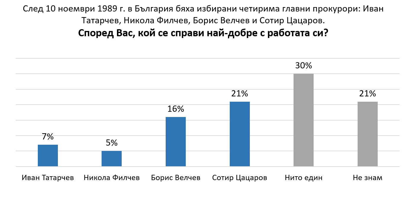 В годината на избор на нов главен прокурор става важен и въпросът кой от главните прокурори се е справил най-добре с работата си, според българите. Въпреки слабата запознатост и традиционен негативизъм, все пак се наблюдават и положителни оценки, като най-много такива събира настоящият главен прокурор – Сотир Цацаров, посочен от 21%. Борис Велчев се е справил най-добре с работата си според 16 на сто от запитаните. Иван Татарчев – посочват 7%, а 5% избират Никола Филчев.