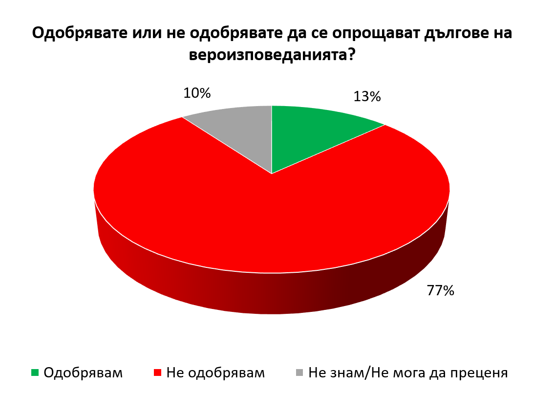 По другата тема от последните седмици, 77% от запитаните не одобряват да се опрощават дългове на вероизповеданията. 13% са на обратното мнение и заявяват своето одобрение, а 10 на сто не могат да преценят. Това показва, че решението тази идея да се преразгледа и прецизира е било в правилна посока, според българите.