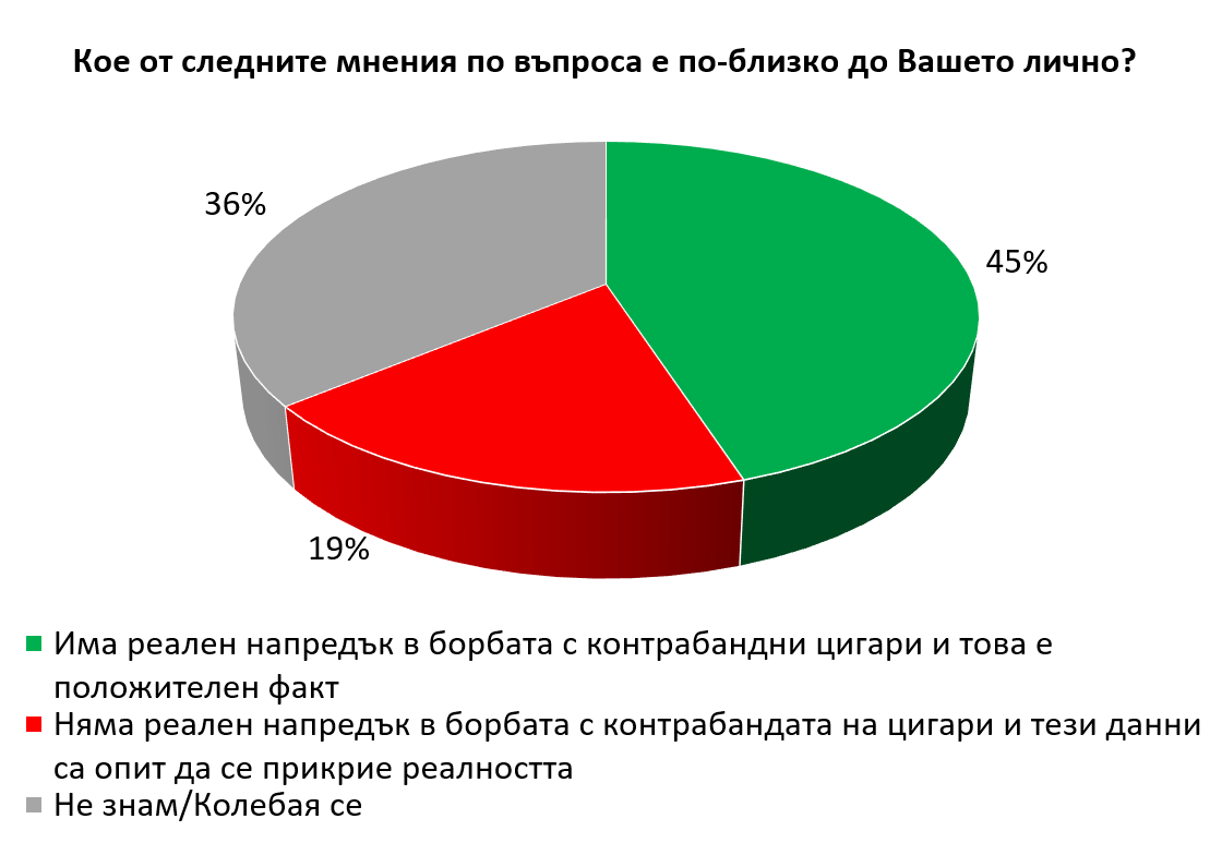 Причината за такъв тип данни вероятно идва и от теми, получили широка гражданственост, като, например, борбата с контрабандата. 45% от запитаните виждат реален напредък в борбата с контрабандни цигари у нас и го отчитат като положителен факт. Според 19 на сто, обаче, няма реален напредък и данните са опит да се прикрие реалността. Висок е и процентът на хората, които се колебаят – 36 на сто.
