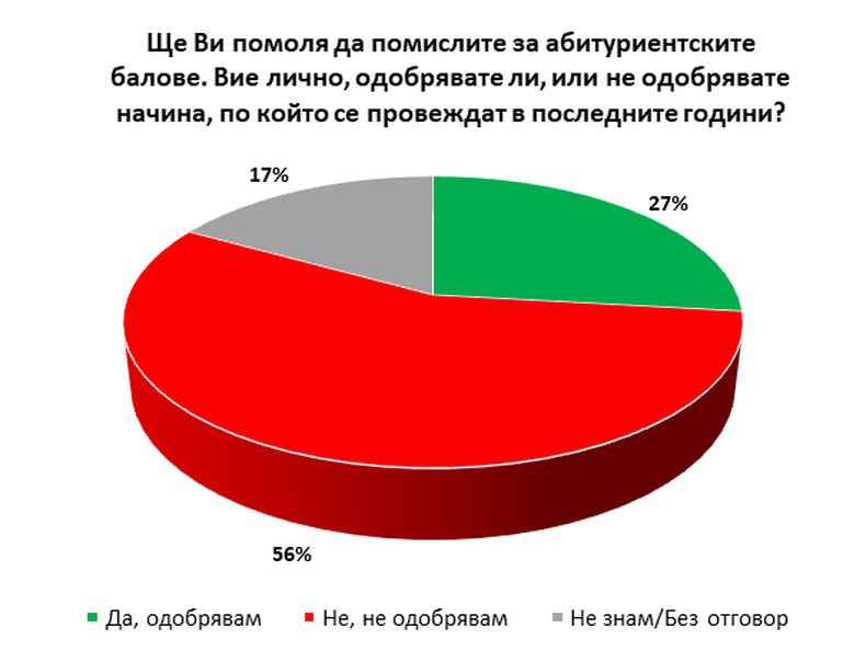 Абитуриентските балове и нещата, свързани с тях, явно събуждат по-скоро негативна реакция сред обществото. 56% не одобряват начина, по който те се провеждат сега, а 27% го одобряват. Сред групите на хората на възраст между 18 и 25 години, както и сред тези на възраст между 26 и 35 години, преобладават онези, които харесват начина, по който се провеждат баловете. При най-младите например има близо 70% одобрение. 70% пък е неодобрението в групата 56+.