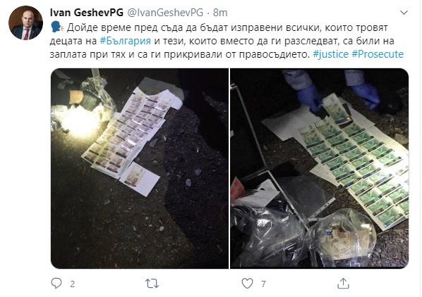 "Дойде време пред съда да бъдат изправени всички, които тровят децата на #България и тези, които вместо да ги разследват, са били на заплата при тях и са ги прикривали от правосъдието. #justice #Prosecute", написа Иван Гешев.