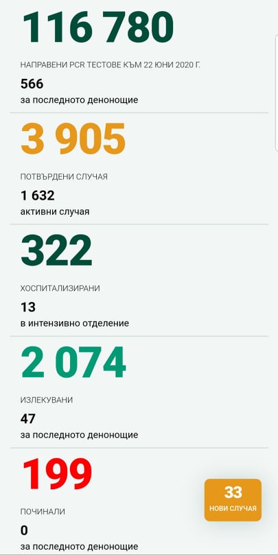 Активните случаи са 1 632. Това сочи справката на Единния информационен портал, обновен преди минути с данните от изследваните през вчерашния 21 юни, видя ПИК.