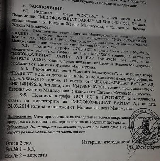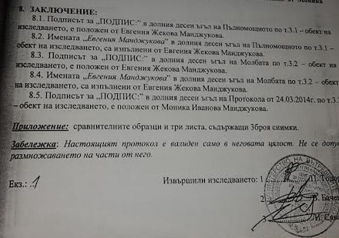 Заключенията на единичната и тройната експертизи доказват, че подписите под документите са на майка и дъщеря Манджукови.