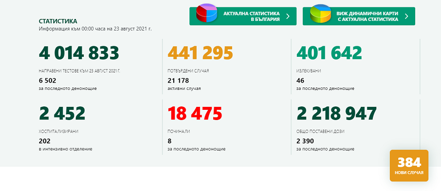 384 са новозаразените с коронавирус у нас за последните 24 часа, видя ПИК в Единния информационен портал. В събота броят на заразените беше 845 души.
