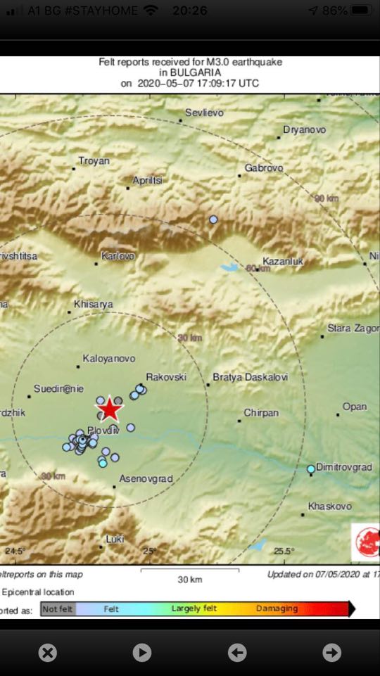 Нов трус край Пловдив е ударил в 20.09 ч, сочат данни от европейския сеизмологичен център.