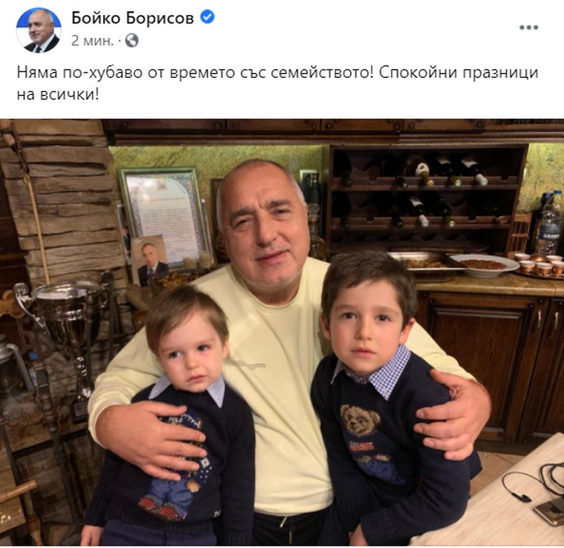 Министър-председателят Бойко Борисов отправи емоционален поздрав към всички българи навръх Бъдни вечер, видя ПИК. В профила си в социалната мрежа Фейсбук премиерът сподели снимка с внучетата си и пожела спокойни празници на всички.