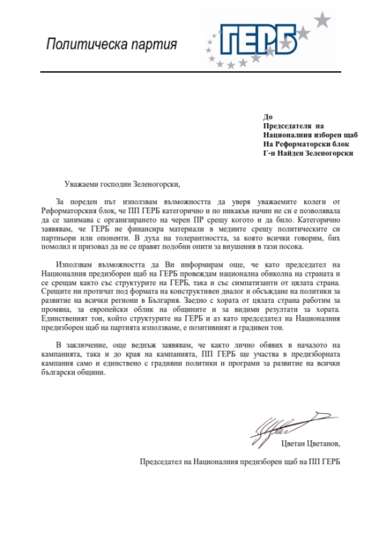 За пореден път използвам възможността да уверя уважаемите колеги от Реформаторски блок, че ПП ГЕРБ категорично и по никакъв начин не си е позволявала да се занимава с организирането на черен ПР срещу когото и да било. Категорично заявявам, че ГЕРБ не финансира материали в медиите срещу политическите си партньори или опоненти. В духа на толерантността, за която всички говорим, бих помолил и призовал да не правят подобни опити за внушение в тази посока.