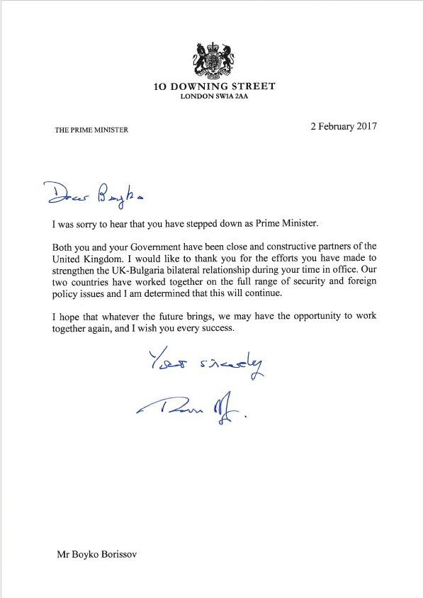 В писмо до лидера на ГЕРБ министър-председателят на Великобритания Тереза Мей благодари за съвместната работа и усилията на Борисов през мандата му като премиер: „Със съжаление разбрах, че сте се оттеглил от поста на министър-председател. Както Вие, така и Вашето правителство бяхте близки и конструктивни партньори на Обединеното Кралство. Бих желала да Ви благодаря за усилията, които положихте, за да засилите двустранните отношения между Великобритания и България по време на мандата си”.
