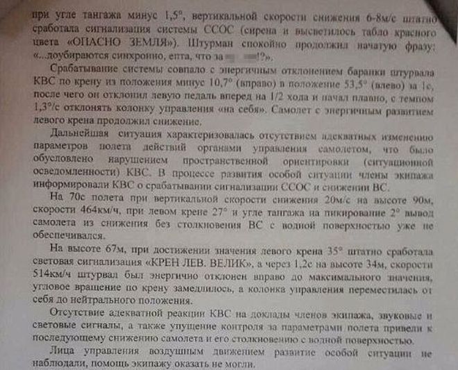 За нарушаването на пространствената ориентировка, според публикувания документ, са допринесли няколко фактора: прекомерното психическо напрежение, емоционално-физическата преумора, а също и отсъствието у капитана на навици за разпределяне на вниманието си. Съобщава се също, че трагедията е станала, в частност, заради отсъствието на необходим и задължителен контрол по изпълнение на полетите от страна на военното командване.