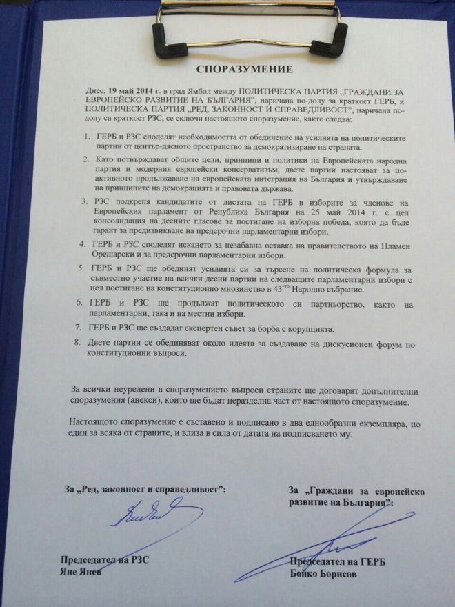 Ето и текста на споразумението между Борисов и Янев: